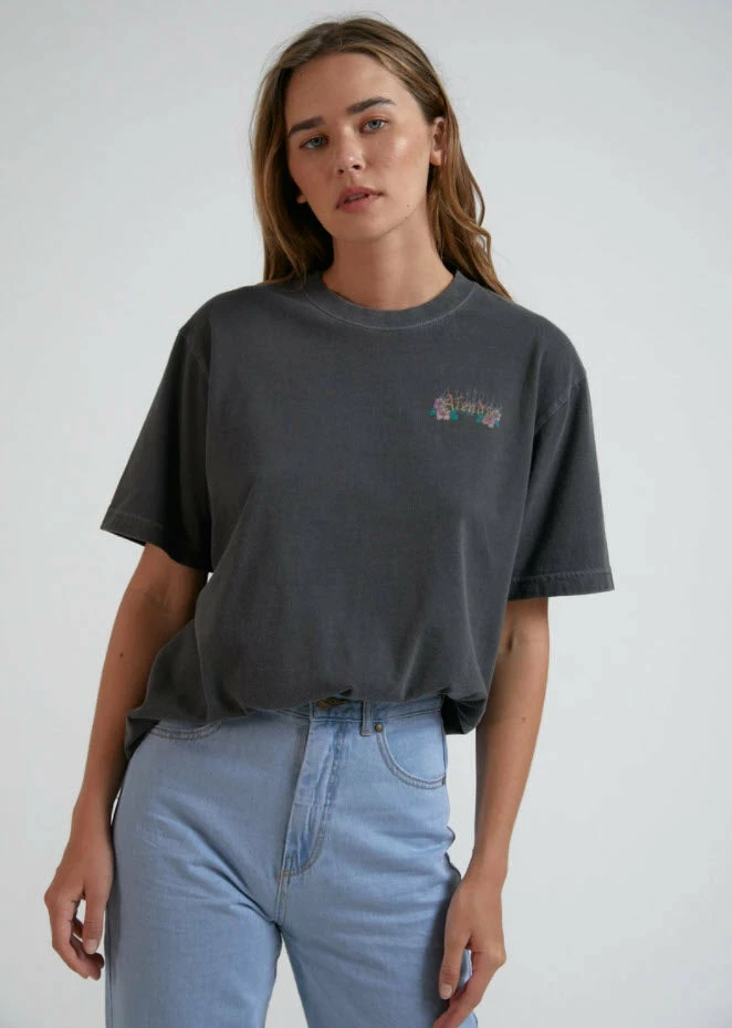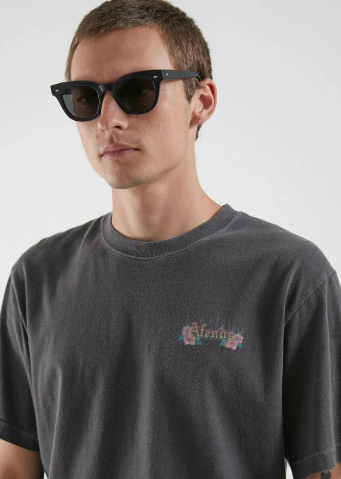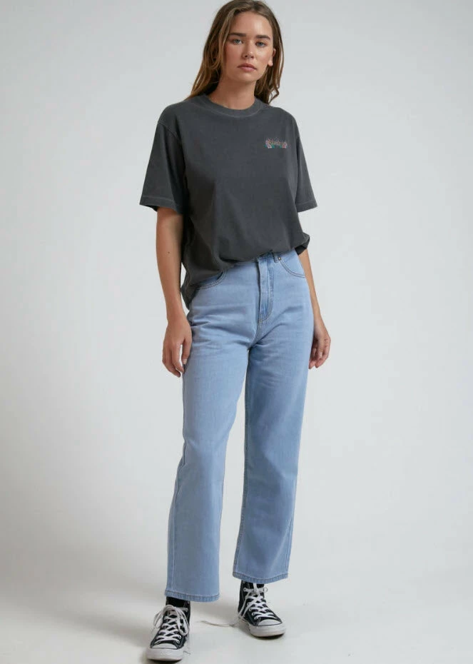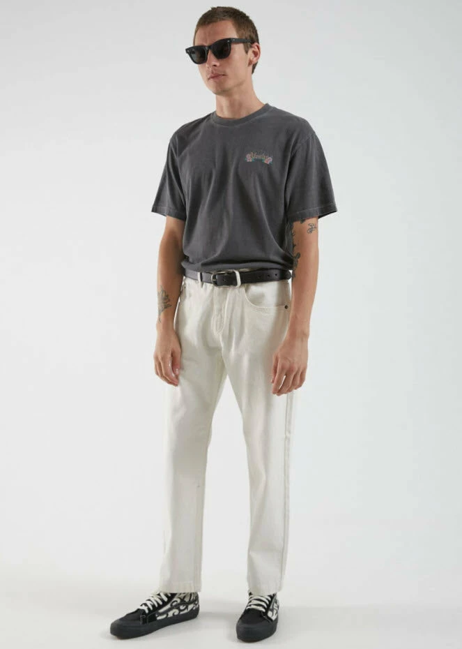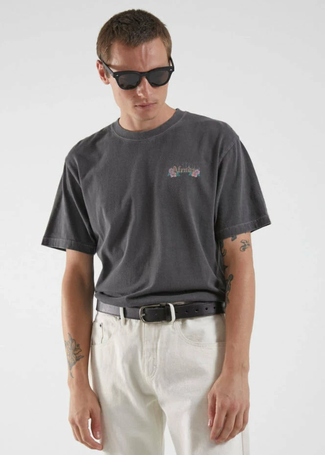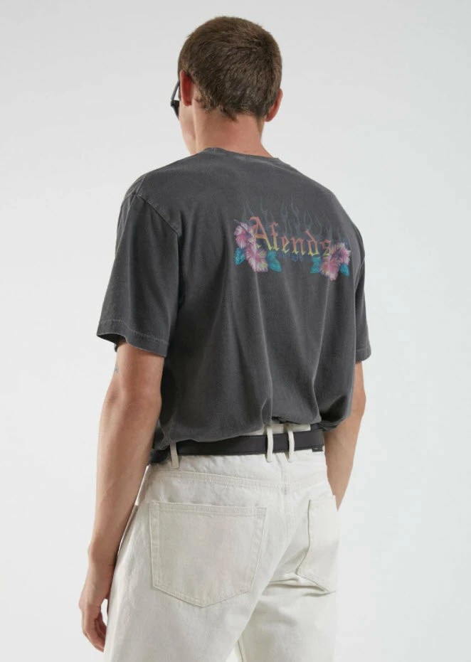 In our classic retro fit, this style features a wide ribbed crew neck, short sleeves, wider body and is finished off Nirvanas custom water-based printed graphics alongside the Afends logo.