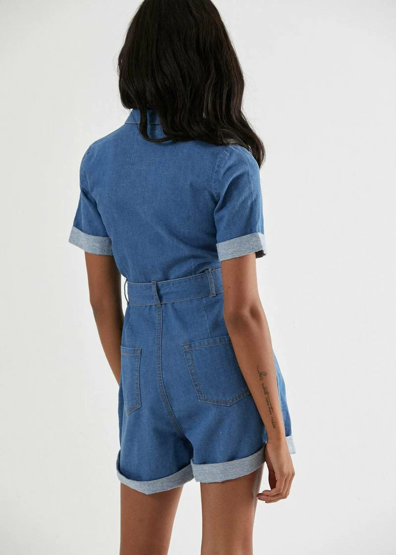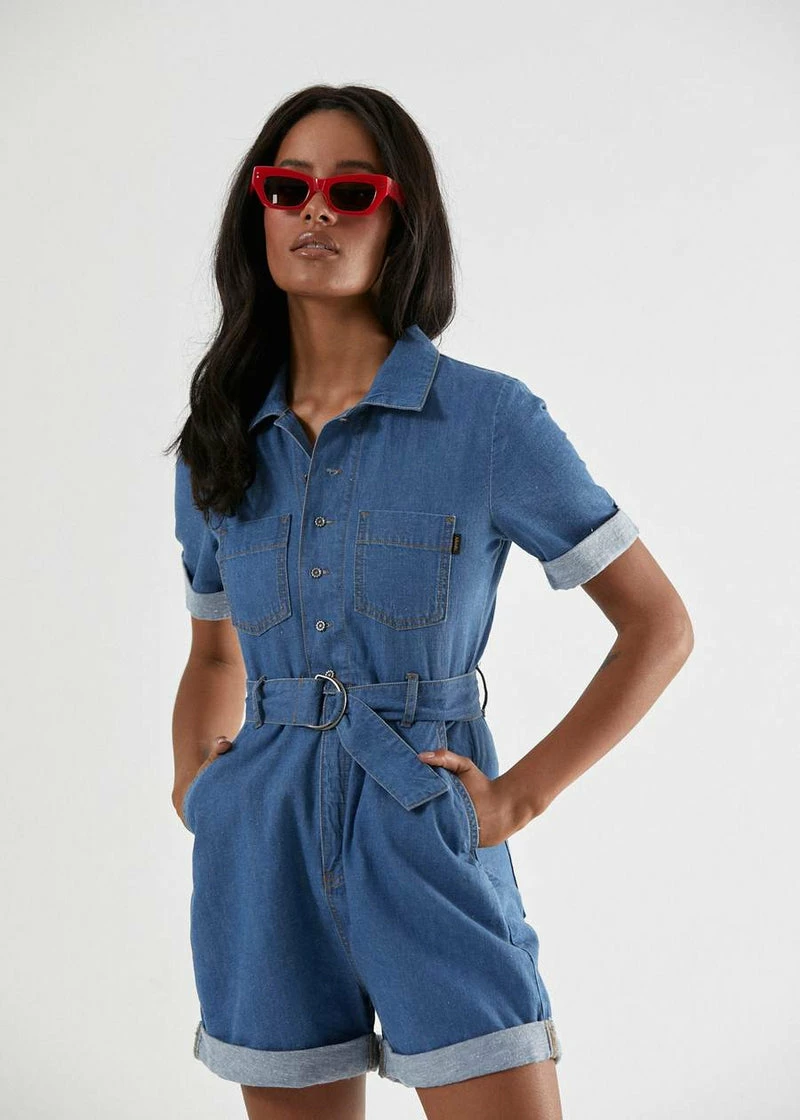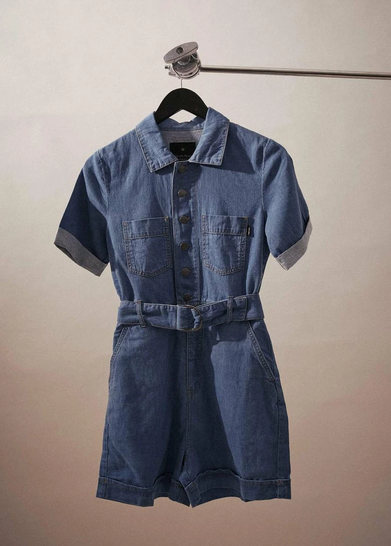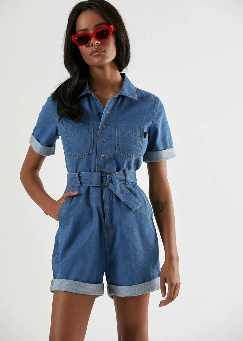 Designed in a relaxed fit with short sleeves and turned up cuffs, this playsuit is finished with a button up front, dual chest pockets, side pockets and an enlarged D-ring fastened self-fabric belt to cinch it in that little bit more at the waist.