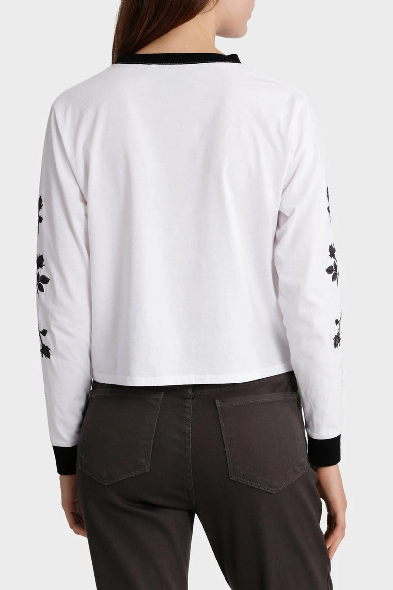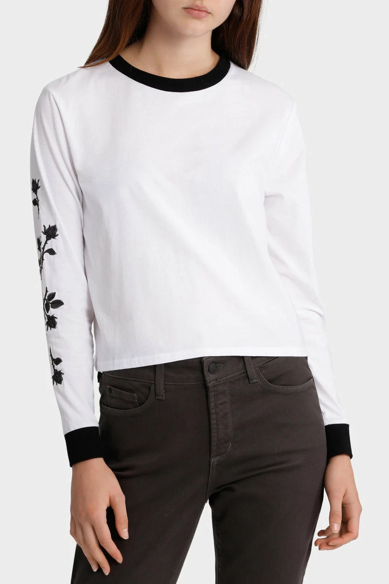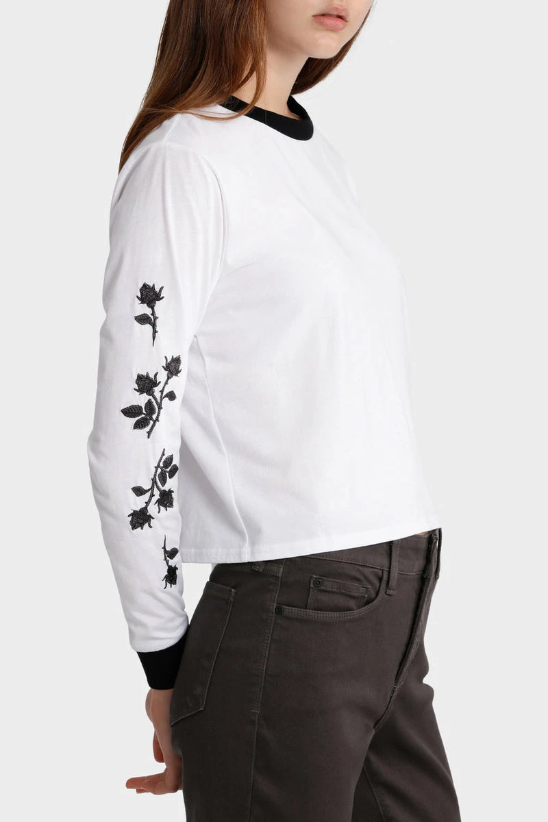 The Nana Judy vine long sleeve tee with a unique contrast rib neckline and rose sleeve embroidery design. This style is part of the future collection.