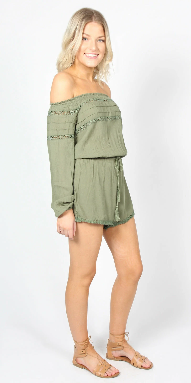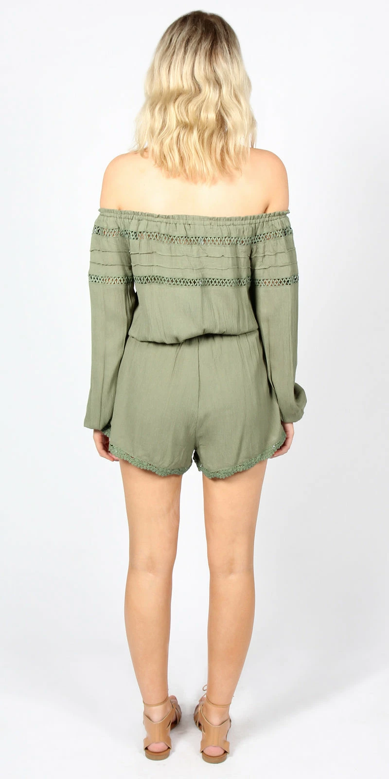 Adding extra style to the summer playsuit, the Talisha Shoulder Playsuit features lace trim, tie waist and is off the shoulder.