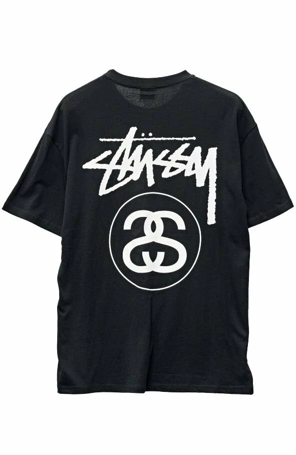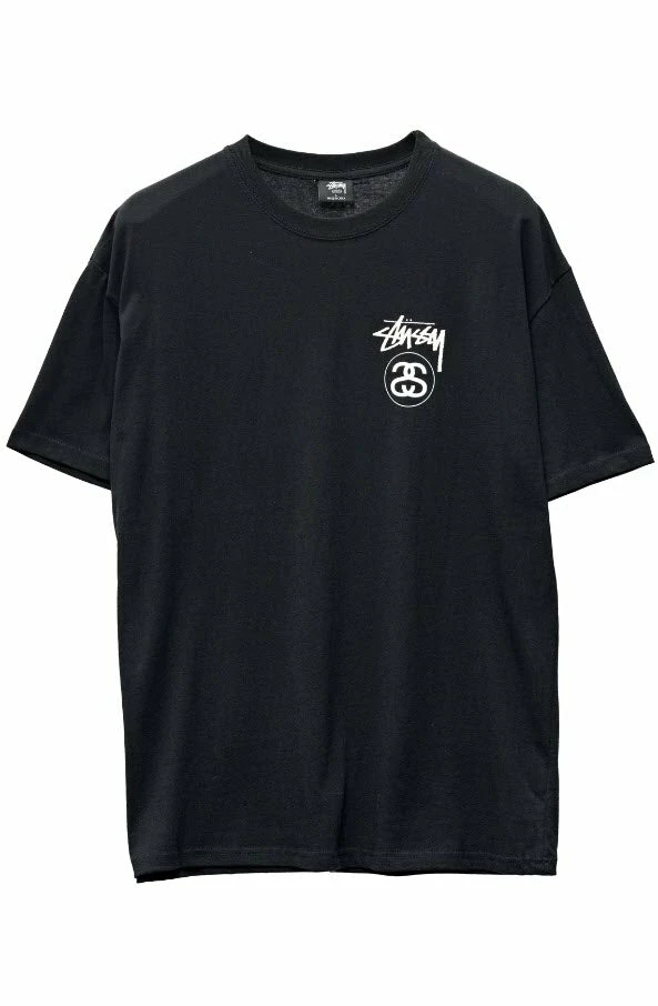 The Stussy Solid Stock Link T-Shirt in Black is a short sleeve tee with rib neckband. Featuring screen printed graphic at left chest and centre back. Flag label at the right seam. Constructed from 100% Carded Cotton Jersey